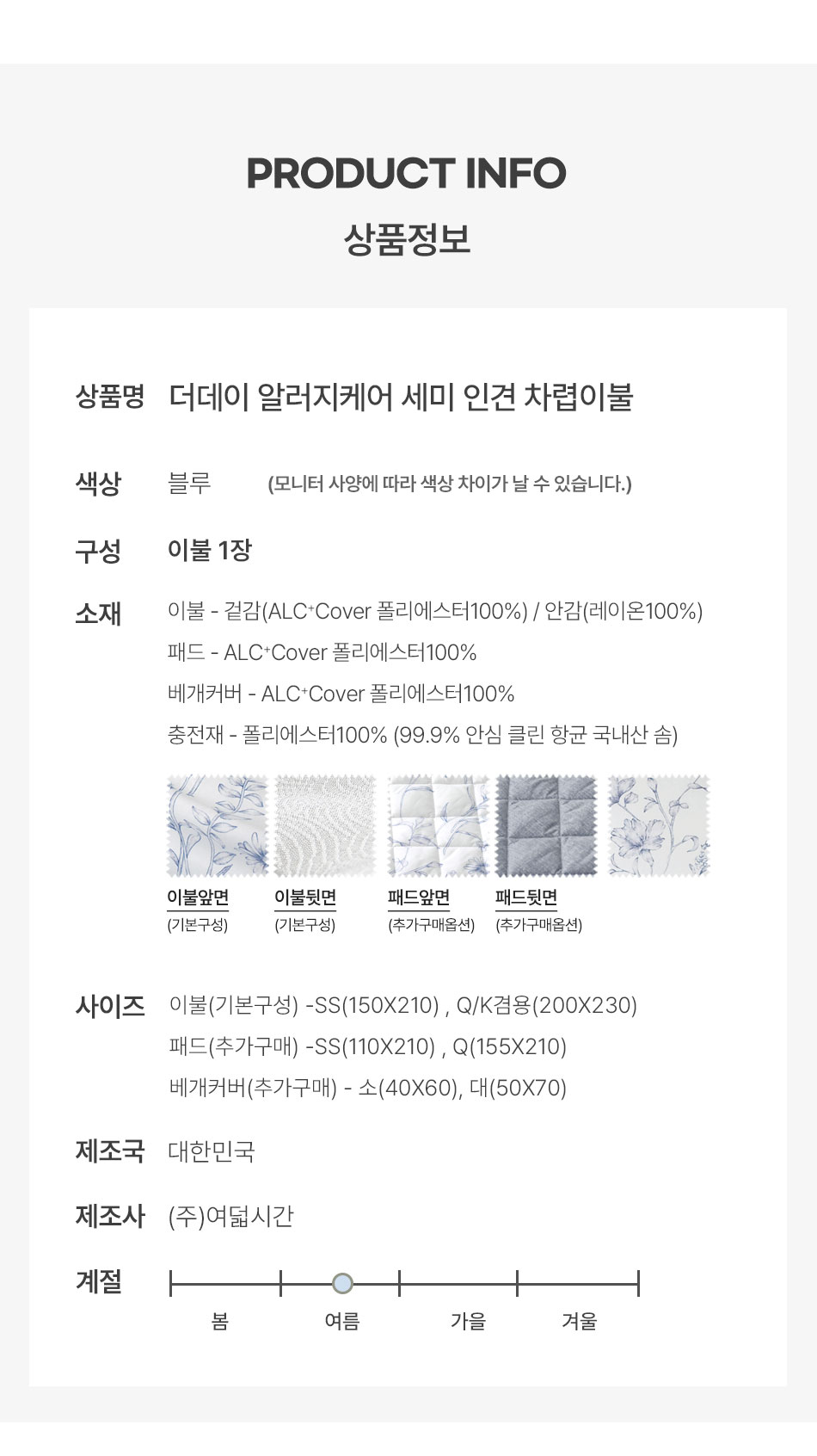 > 더데이 알러지케어 세미인견 차렵이불 SS/Q