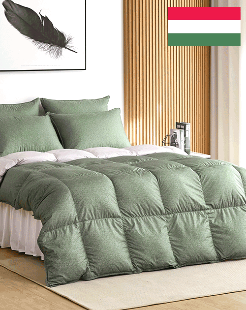 최고급 헝가리산 구스에 클푸의 ALC+COVER 기술을 더한 프리미엄 구스다운 제품 니트조직 같은 느낌의 그린톤의 겉면과 성글게 짜인 광목을 연상시키는 연베이지컬러 뒷면